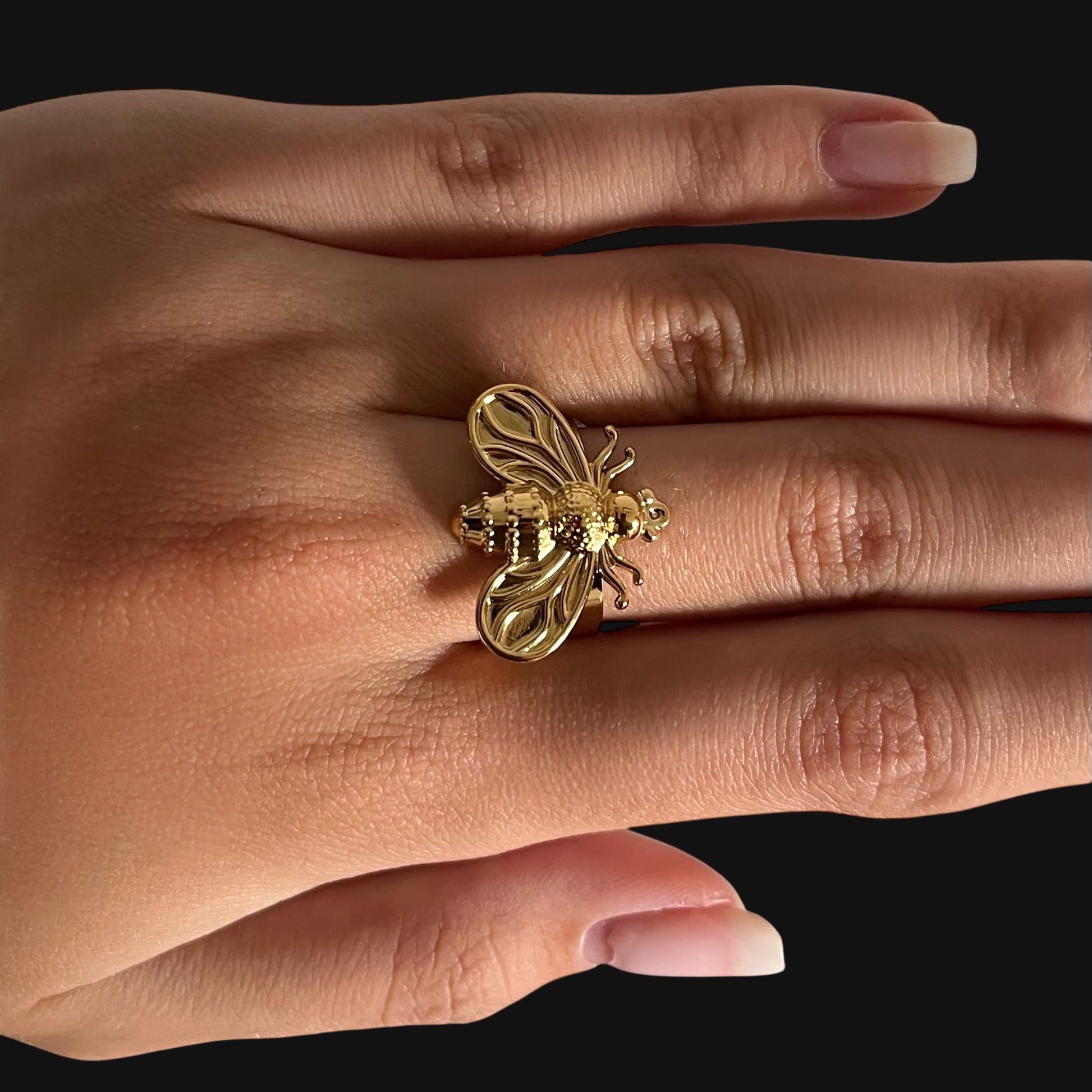 Vår Bee Ring är en symbol för styrka, uthållighet och gemenskap. Inspirerad av biets natur påminner ringen oss om kraften i att aldrig ge upp och att alltid hitta vägen framåt – oavsett hinder. Den eleganta designen balanserar enkelhet och uttryck, vilket gör den till ett meningsfullt smycke som lyfter varje stil med en subtil men stark karaktär. Ett smycke för dig som bär din inre styrka med stolthet.